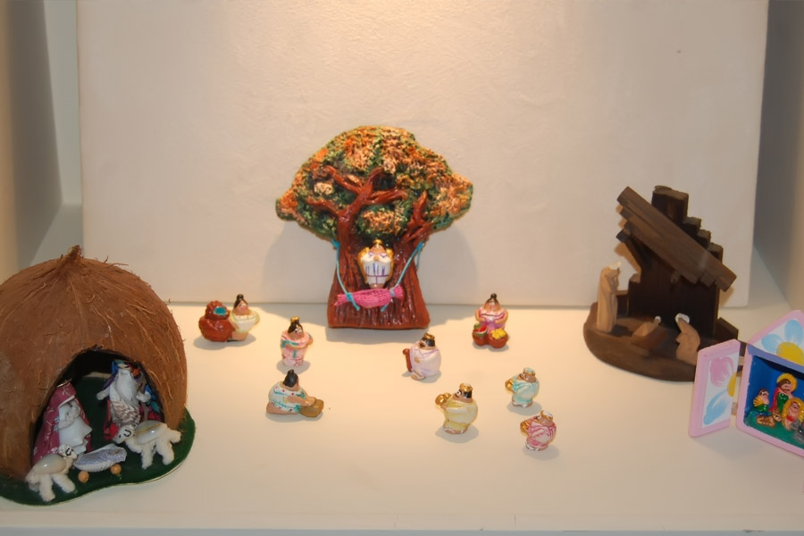 Dentro de esta interesante colección, instalada en la Sala Contemporánea del museo, lo mismo se encuentran nacimientos con figuras elaboradas en cristal, al que algunos otros de barro, madera o incluso confeccionados a manera de vitral, de matrioskas, o bien plasmados al óleo sobre diversos objetos, como un pequeño biombo de tres secciones que contiene las imágenes de la Virgen María, San José y el Niño Jesús.
