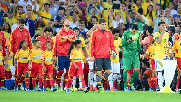 A los tan solo 95 segundos del partido Fred anoto el primer gol contra los españoles dejándolos perplejos y aún sin saber bien que los sacudió a tan solo un par de minutos del primer gol, Oscar ya les sacaba un buen susto, tanto así que Ramos recibe infracción por cometer le falta a Oscar.