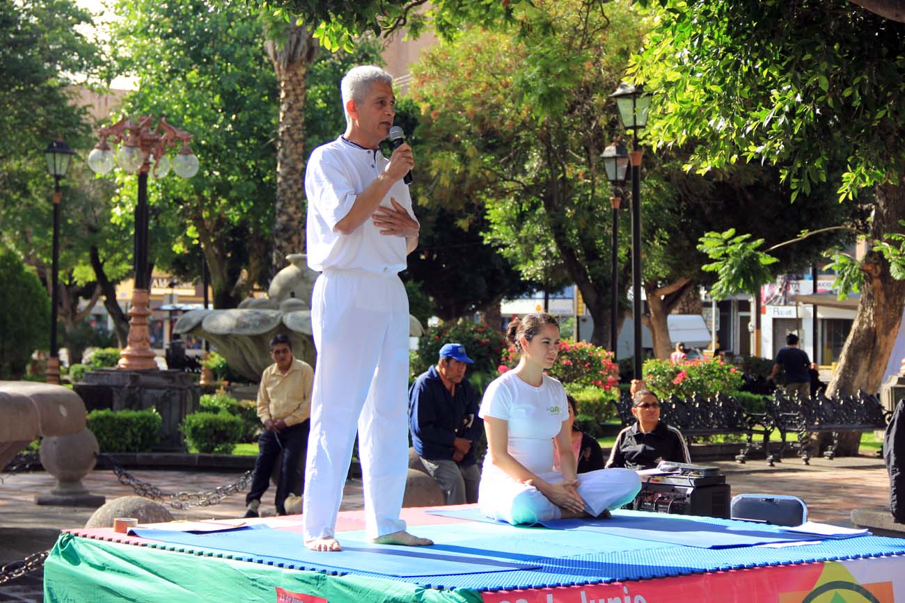 Maricela Vieira dio el primer calentamiento suave para dar paso al Hatha Yoga que fue impartido por el Ing. Luis Octavio Flores, como punto culmínate la práctica de Kundalini Yoga fue dirigida por la Profesora Very Olivo y para terminar la Practica masiva de Yoga la maestra Patrizia Cantarelli dio el cierre y la relajación para terminar con los festejos de Día Mundial de la Yoga.