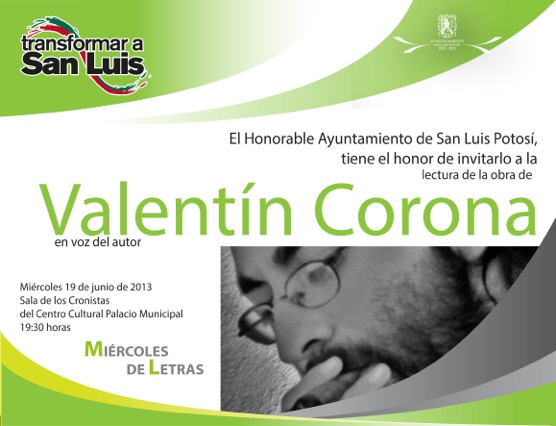 El Ayuntamiento de San Luis Potosí invita a todo el público en general para qué disfrute delMiércoles de Letras, programa a cargo de Cultura Municipal; en esta ocasión contará con la presencia del narrador potosino Valentín Corona, quien leerá en voz alta una selección de su obra.