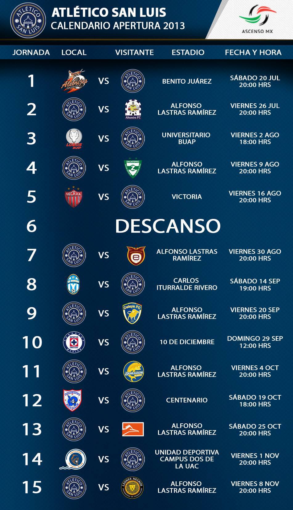 Se dio a conocer de forma oficial las fechas en las que estará participando el equipo del Atlético San Luis dentro de la Liga de Ascenso MX ,  destacando que en la fecha 6 habrá un único descanso .