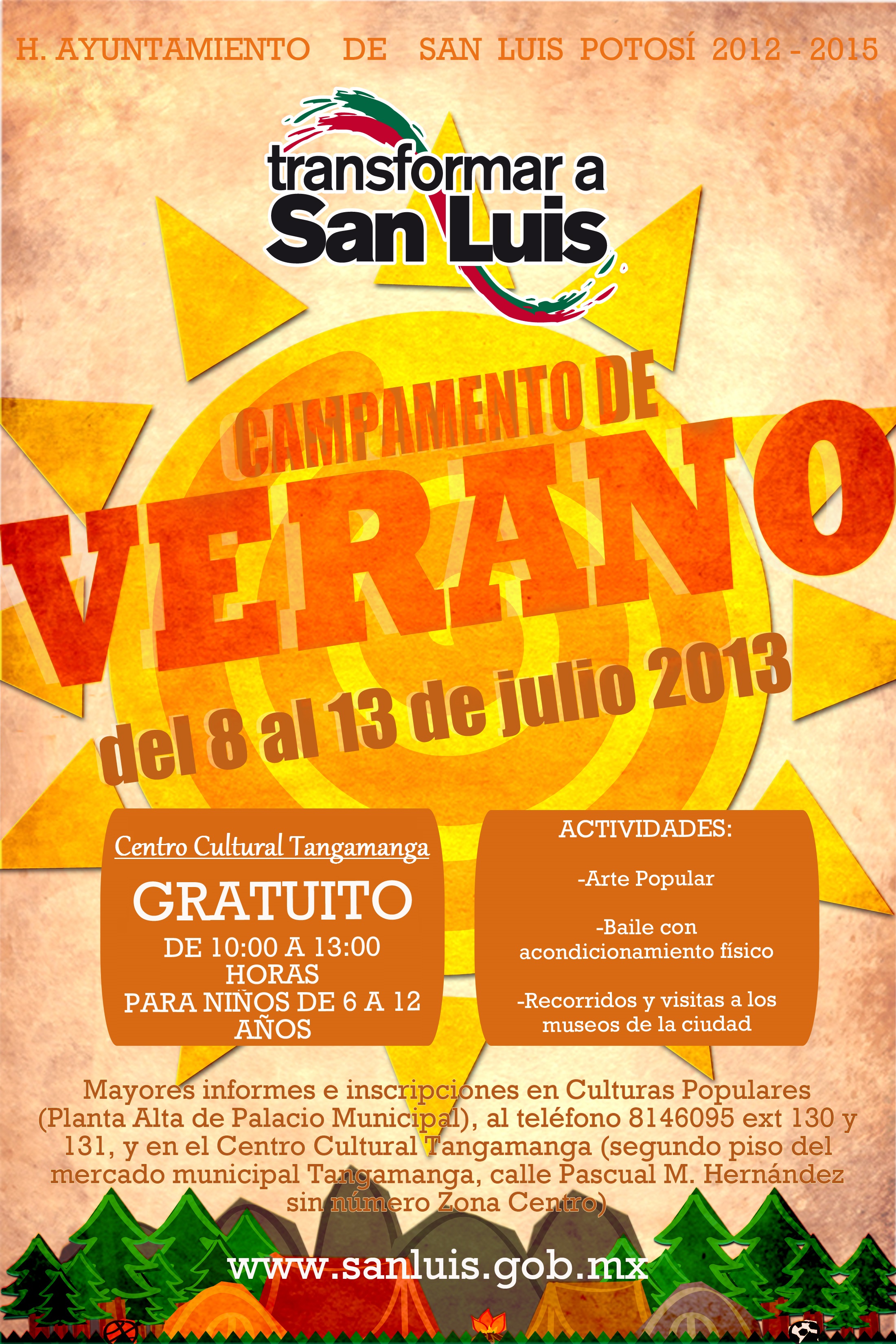 La Subdirección de Cultura del Ayuntamiento de San Luis Potosí, invita a todos los niños de 6 a 12 años, a que participen en las diferentes actividades que se realizarán como parte del campamento de verano en el Centro Cultural Tangamanga.
