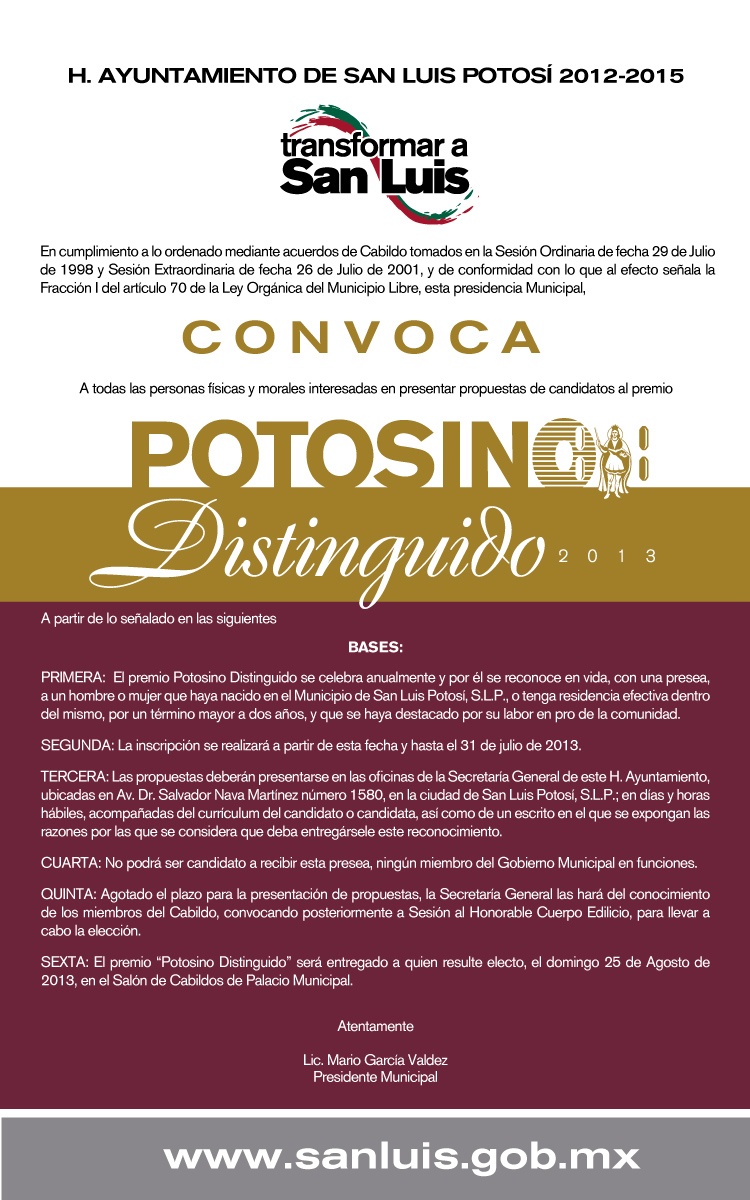El Premio “Potosino Distinguido 2013”, será entregado a quien resulte electo, el domingo 25 de agosto, en sesión solemne que se celebrará en el Palacio Municipal.