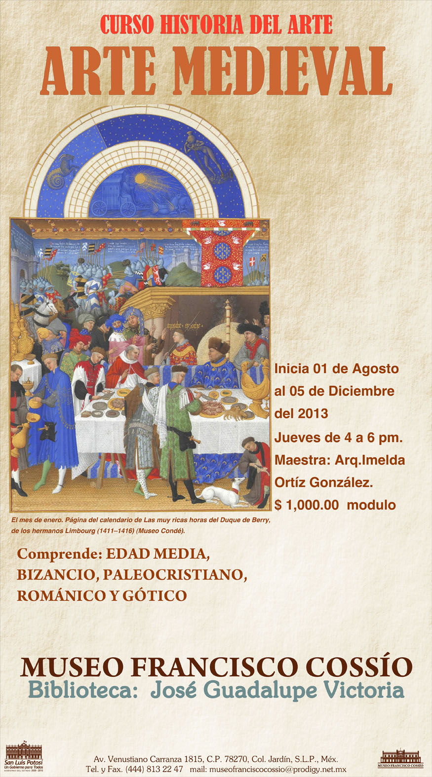 Licenciada en Arquitectura, con especialidad en Historia del Arte Mexicano, y se realizará en el periodo del 01 de agosto al 05 de diciembre y tendrá un costo de $1000 pesos por todo el curso, las inscripciones ya están abiertas y puede inscribirse en nuestras instalaciones ubicadas en Av. Venustiano Carranza No. 1815, antes Casa de la Cultura, en un horario de 11:00 a 18:00 hrs.