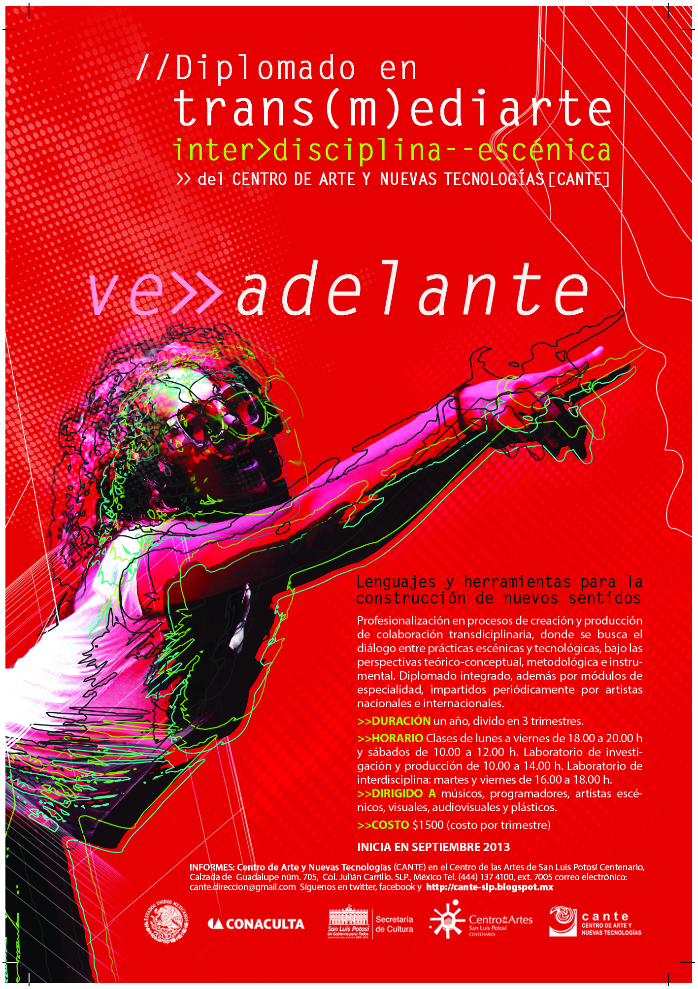 Informes: Centro de Arte y Nuevas Tecnologías (CANTE) en el Centro de las Artes de San Luis Potosí Centenario, Calzada de Guadalupe núm. 705. Col. Julian Carillo,SLP,México. Tel. 444 1 37 4100 ext. 705 correo electronico : cante.direccion@mail.com