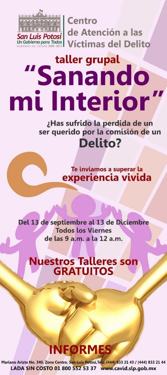 El Centro de Atención para Víctimas del Delitos llevará a cabo el taller grupal “Sanando mi Interior”, dirigido a personas que han perdido a un ser querido, con el objetivo de de darles herramientas para superar su perdida y potencializar los recursos que cada persona tiene. El evento tendrá lugar del 13 de septiembre al 20 de diciembre del año en curso.