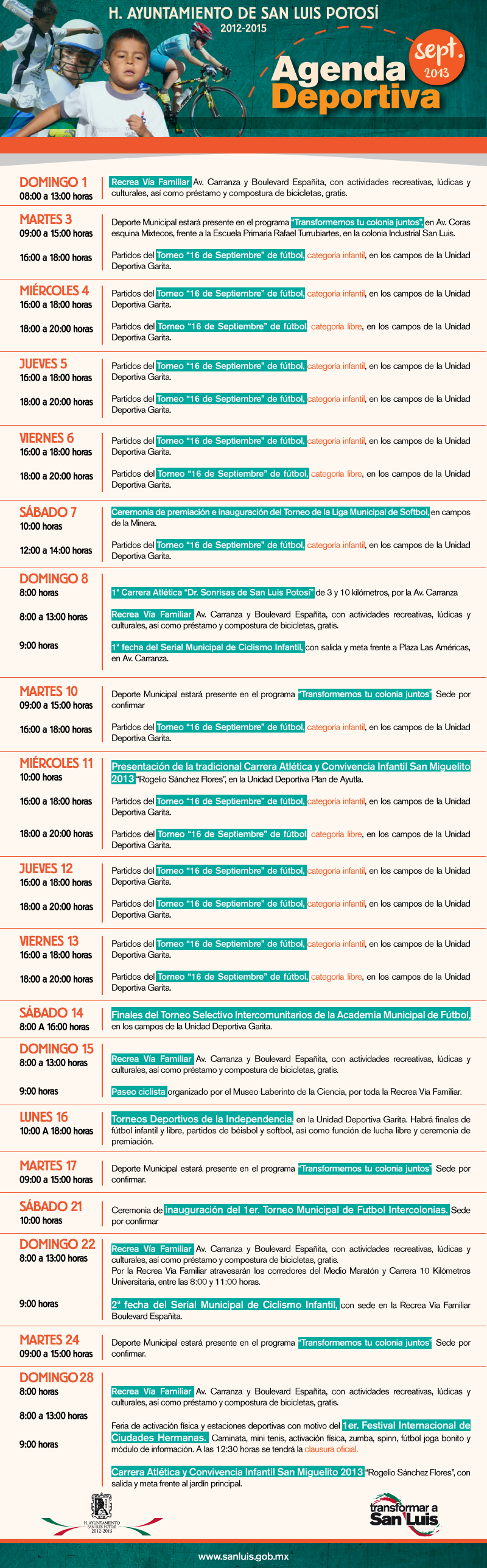 El H. Ayuntamiento de San Luis Potosí a través de la Dirección de Desarrollo Municipal y Subdirección de Deporte Municipal dan a conocer la agenda de eventos programados para el mes de septiembre.