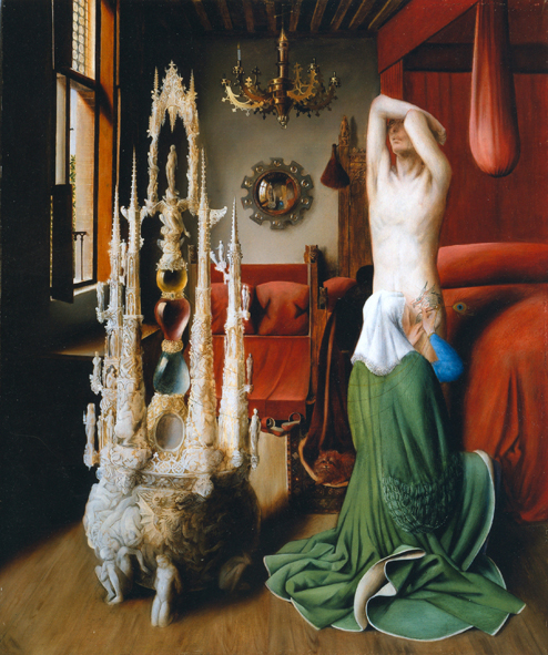 En sus primeras exposiciones aparecen sus pinturas con temas de monjas floridas y alacenas, y ya en 1985 inició la serie dedicada al matrimonio Arnolfini, inspirada en la obra del extraordinario pintor flamenco Jan van Eyck intitulada “El Retrato de Giovanni Arnolfini y su esposa” fechado en 1434, donde se representa al rico mercader Giovanni Arnolfini y a su esposa Jeanne Cenami,