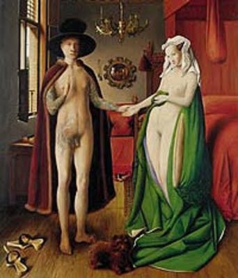 En sus primeras exposiciones aparecen sus pinturas con temas de monjas floridas y alacenas. En 1985 inició la serie dedicada al matrimonio Arnolfini, inspirada en la obra del extraordinario pintor flamenco Jan van Eyck intitulada “El Retrato de Giovanni Arnolfini y su esposa” fechado en 1434, donde se representa al rico mercader Giovanni Arnolfini y a su esposa Jeanne Cenami,