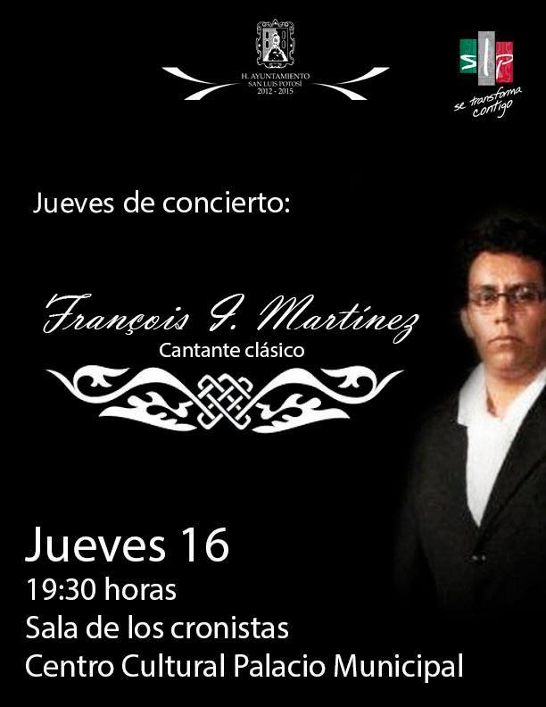 Sobre la actividad que se desarrollará el jueves es una demostración de una variación de la opera a través de la interpretación de arias, por parte del contratenor, Francois I. Martínez, quien deleitará con su peculiar voz, a las personas que asistan a este concierto, con el cual se mantiene vigente el apoyo a artistas potosinos.