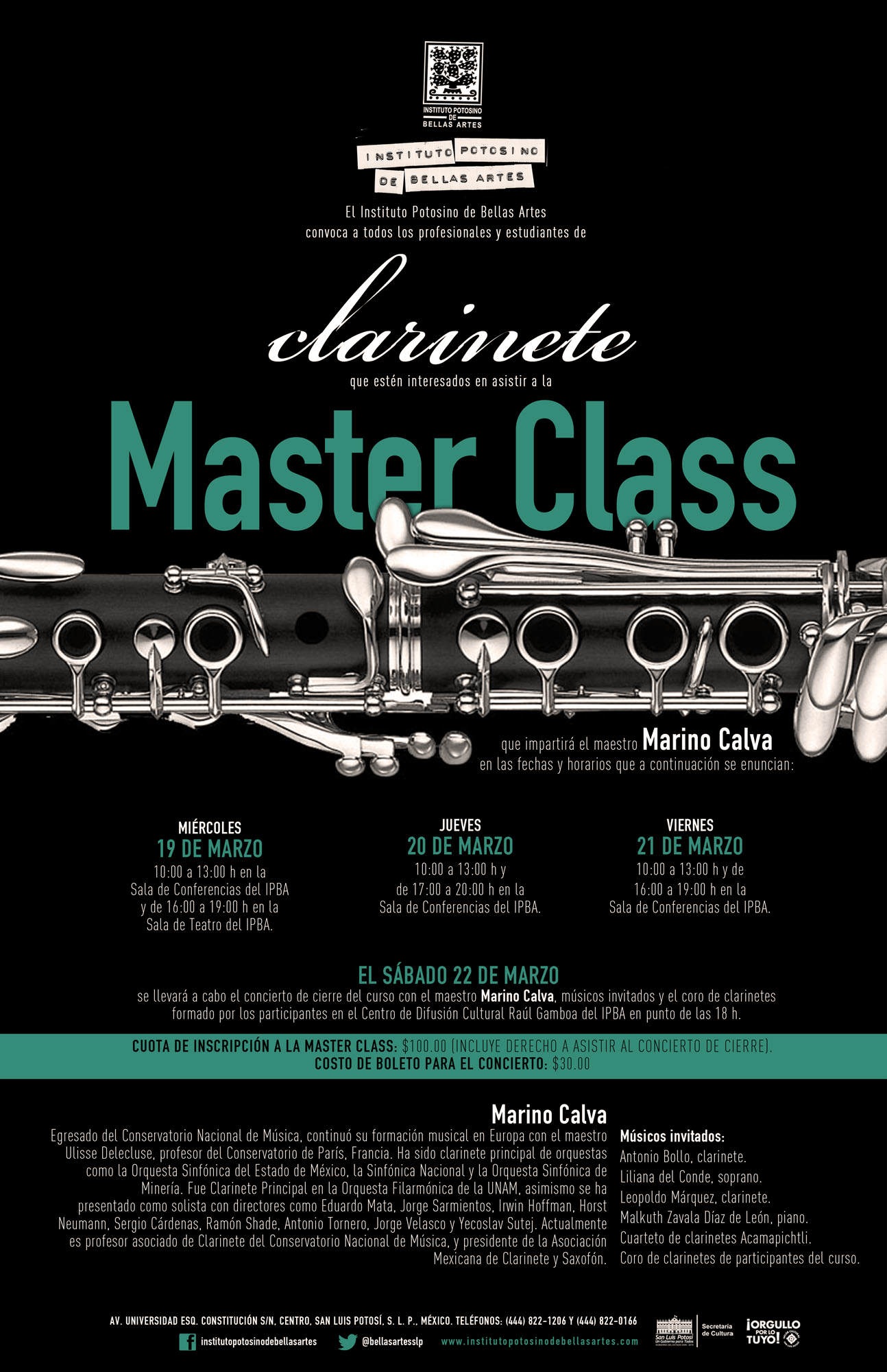 Se invita a los estudiantes de música y maestros participación de un Master Class que impartirá el maestro Marino Calva este 19, 20,21 y 22 de Marzo en el Instituto Potosino de Bellas Artes.