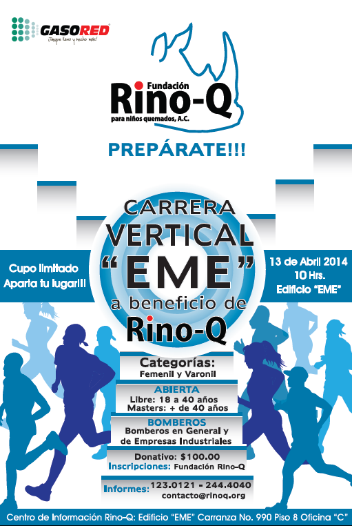 La fundación Rino-Q para niños quemados, A.C, invita a los atletas y público en general a participar a la carrera vertical “EME”, que se realizará el próximo 13 de abril a las 10:oo hrs. en el Edificio “EME” (Carranza No. 990).
