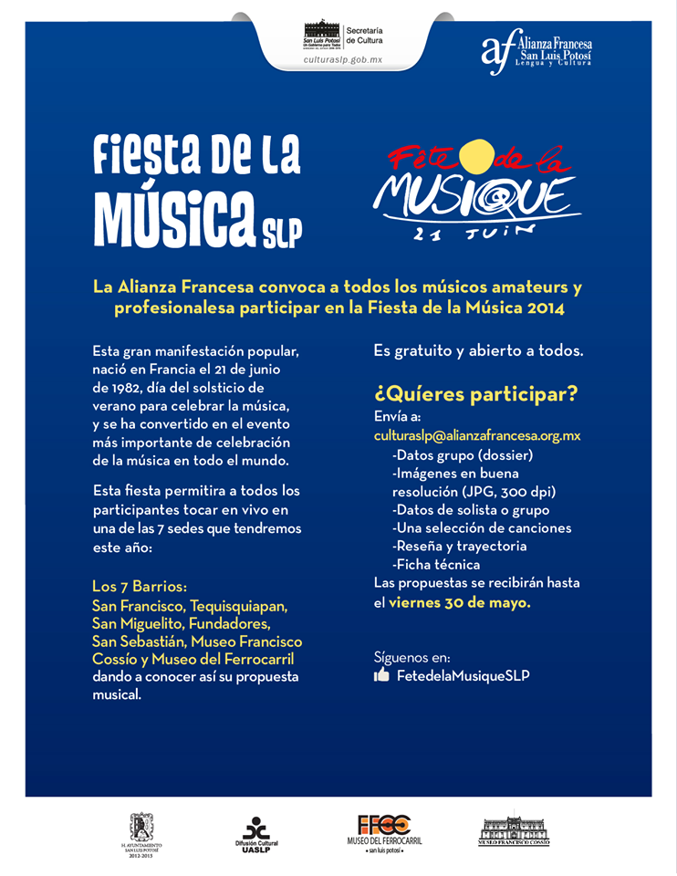 Por tercer año consecutivo, gracias a colaboración del Gobierno del Estado, a través de la Secretaría de Cultura; la Universidad Autónoma de San Luis Potosí; y la Alianza Francesa de San Luis Potosí, el próximo 21 de junio se llevará a cabo la Fiesta de la Música, y para realizar la programación correspondiente, ésta última institución dio a conocer la convocatoria dirigida a grupos y solistas aficionados o profesionales para que participen en esta celebración, con la intención de seleccionar a 7 participantes, y dos de los seleccionados recibirán un estímulo especial.