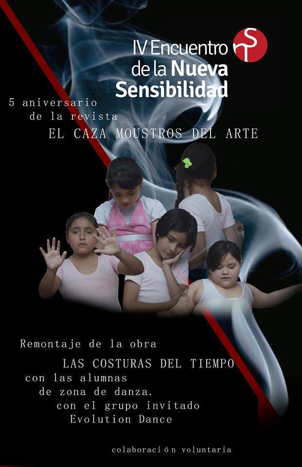 Como clausura de las actividades programadas en este IV Encuentro de la Nueva Sensibilidad que se llevan a cabo en la Guarida del Coyote, este domingo 1 de junio a las 12:00 se presenta la obra Las Costuras del Tiempo coreografía del Mtro. Arturo Garrido con la interpretación de las alumnas de Zona de Danza, como parte de la presentación con la que inicia formalmente los festejos de aniversario de la publicación infantil Los Cazamonstruos del Arte.