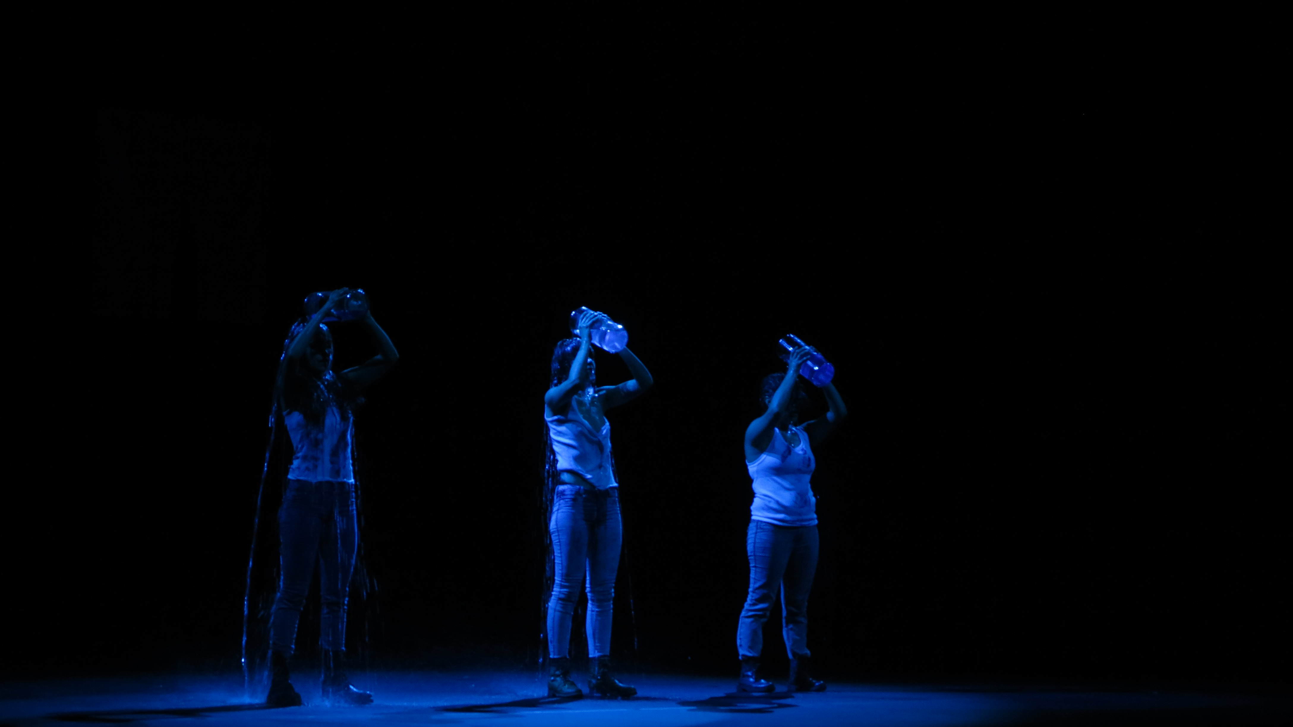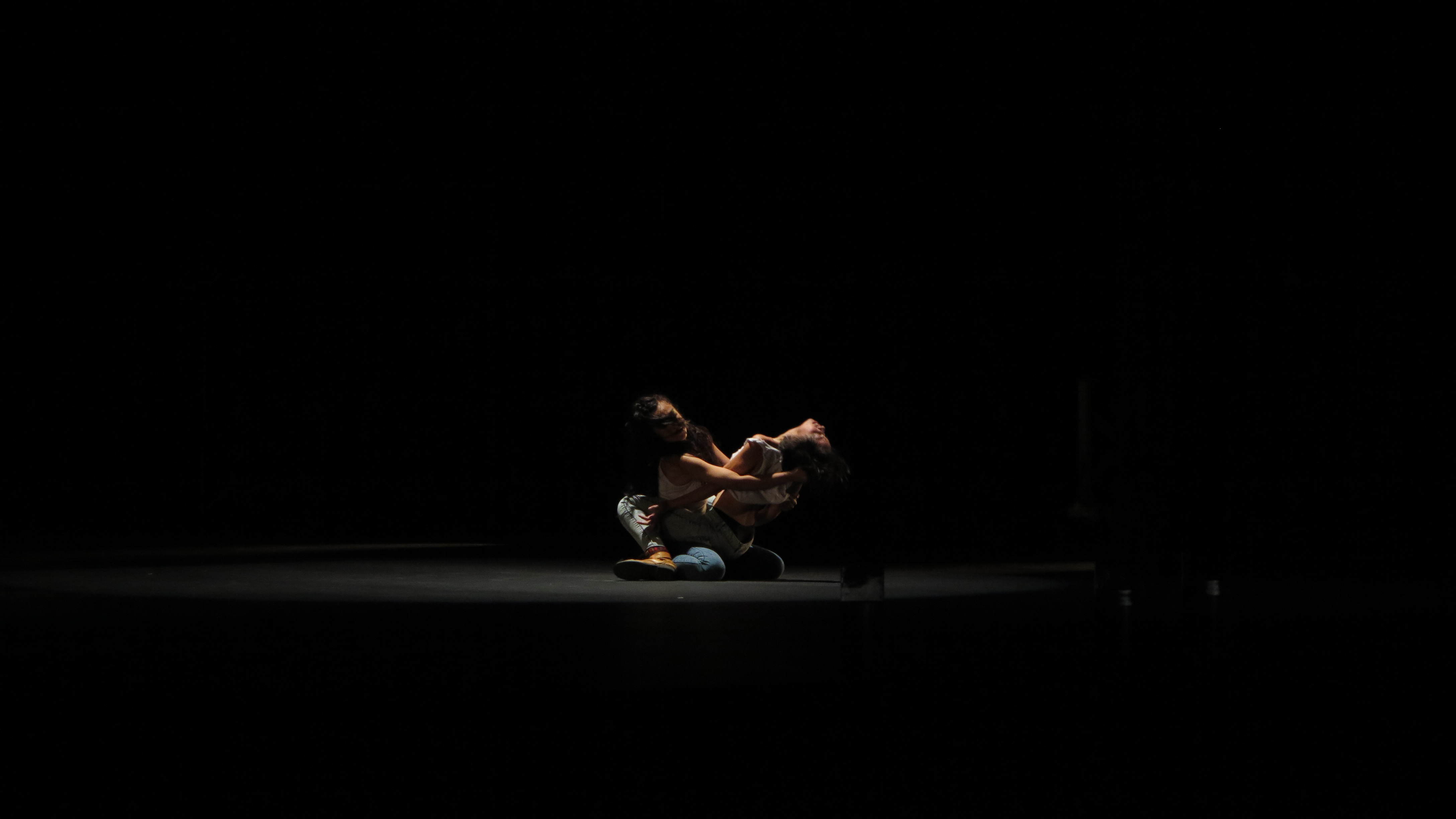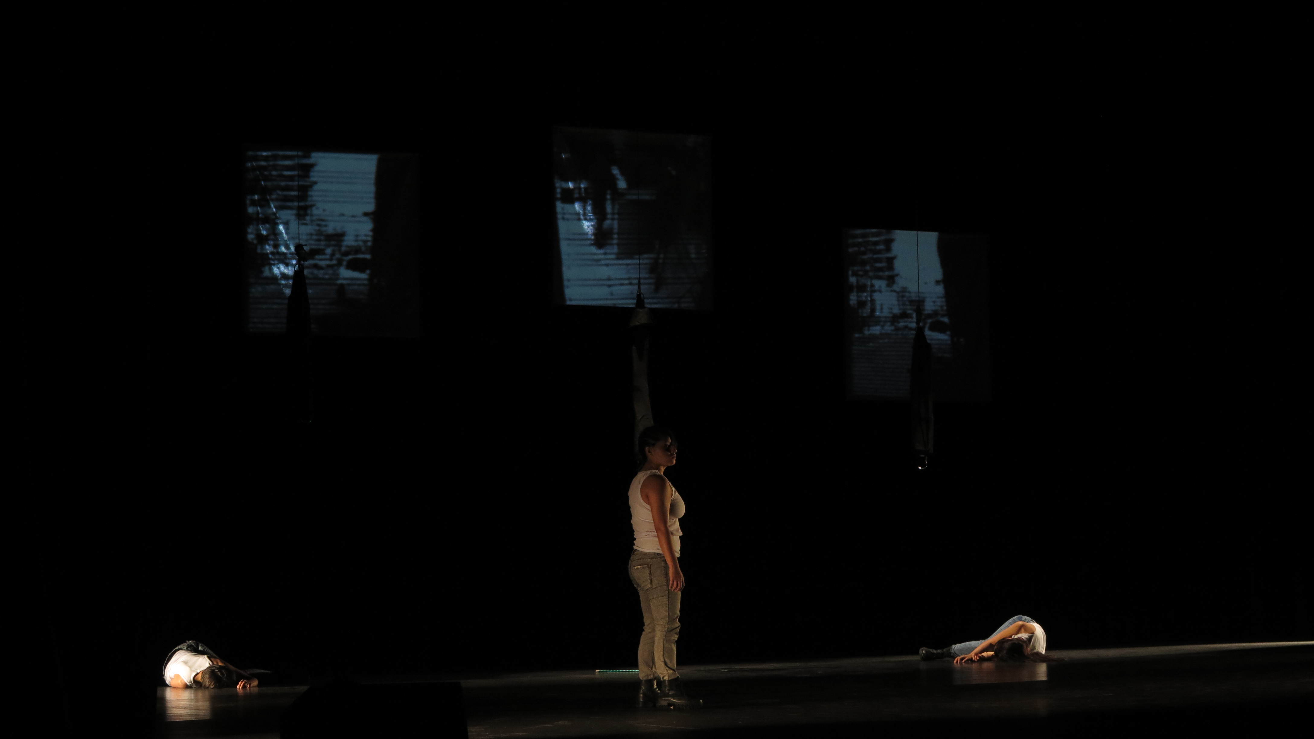 Tres cuerpos. Dos cuerpos. Un cuerpo. Uno sólo, sometido por la oscuridad de cuatro pantallas que reflejan la realidad del mundo. Dos cuerpos, persiguiéndose sin tener certeza del lugar en el que hunden sus pies, luchando entre ellos ante la luz del exterior, la oscuridad interna, y viceversa. Tres cuerpos, dos sometiendo a uno: presentándonos el contraste de quien pega y quien no sólo pone la otra mejilla, sino que se abandona ante el primero. Y al final el carajo depositado en frascos, el carajo que nos humedece, un mal intento de depuración, el carajo que llega cuando estamos a punto de reventar; “La naturaleza humana revela nuestra impotencia que actualmente no nos conduce a nada”.