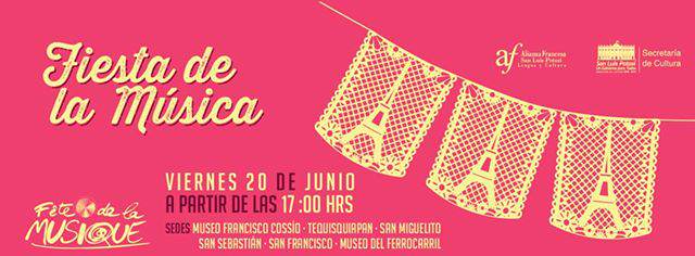 Por tercer año consecutivo, gracias a colaboración del Gobierno del Estado, a través de la Secretaría de Cultura; la Universidad Autónoma de San Luis Potosí; y la Alianza Francesa de San Luis Potosí, llevarán a cabo este viernes 20 de junio se llevará la Fiesta de la Música, para la cual previamente se lanzó una convocatoria dirigida a grupos y solistas aficionados o profesionales para que participasen en esta celebración, que se extenderá a 6 diferentes sedes.