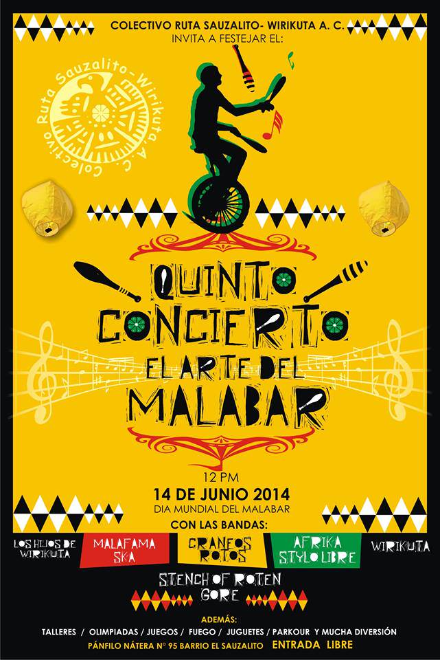 El Colectivo Ruta Sauzalito-Wirikuta A.C, invita este sábado 14 de junio en las instalaciones del mercado cultural sauzalito-wirikuta (Pánfilo Nátera N95 en el Sauzalito) que hace unos años recuperaría como espacio para ejercer el arte y deporte, a la celebración del día mundial del malabar con una serie de talleres,olimpiadas , juegos, fuego, juguetes. parkour así como un concierto de música.