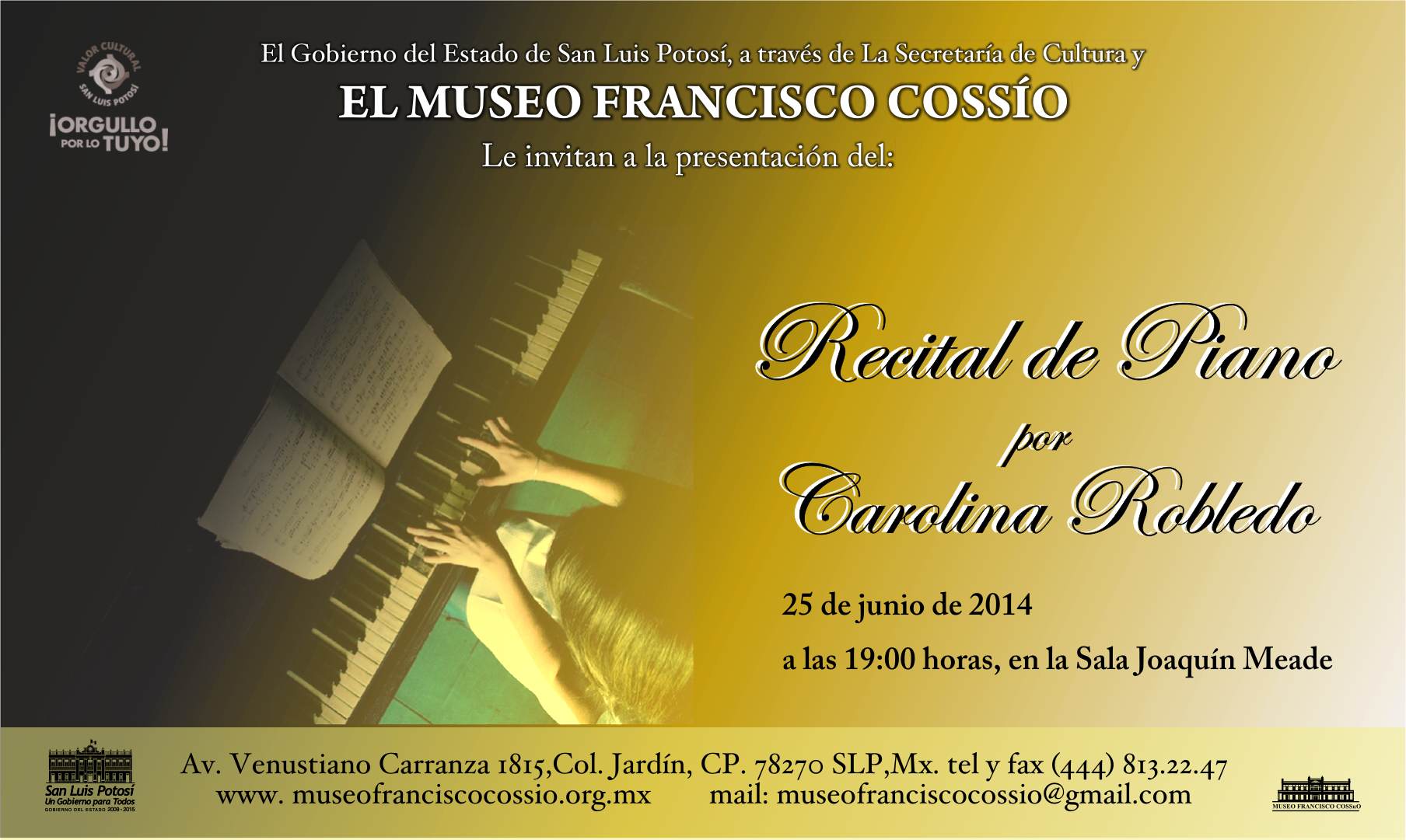 Este miércoles 25 de junio en punto de las 19:00 hrs. El Museo Francisco Cossío, invita al Recital de piano de Carolina Robledo en la Sala Francisco de la Maza, la entrada es libre.