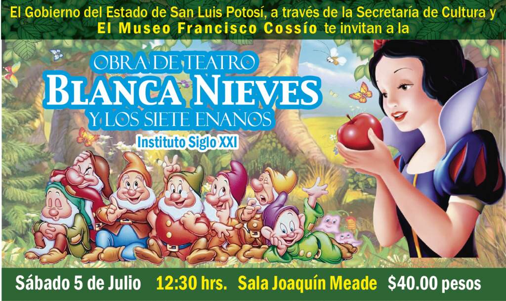 Comience el fin de semana en el Museo Francisco Cossío y traiga a sus pequeños este 05 de julio a la Sala Joaquín Meade de este museo, ya que se estará presentando la obra de teatro Blanca Nieves y los Siete Enanos, por la compañía de teatro del Instituto Educación Siglo XXI.