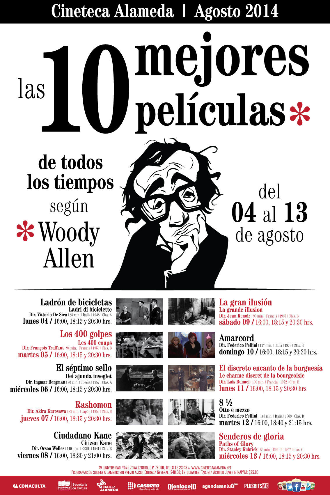 El ciclo está conformado por las películas Ladrón de Bicicletas (Vittorio De Sica, 1948), Los 400 Golpes (Francois Truffaut, 1959), El Séptimo Sello (Ingmar Bergman, 1957), Rashomon (Akira Kurosawa, 1950), Ciudadano Kane (Orson Welles, 1941), La Gran Ilusión (Jean Renoir, 1937), Amarcord (Federico Fellini, 1973), El Discreto Encanto de la Burguesía (Luis Buñuel, 1972), 8 1/2 (Federico Fellini, 1963) y Senderos de Gloria (Stanley Kubrick, 1957).