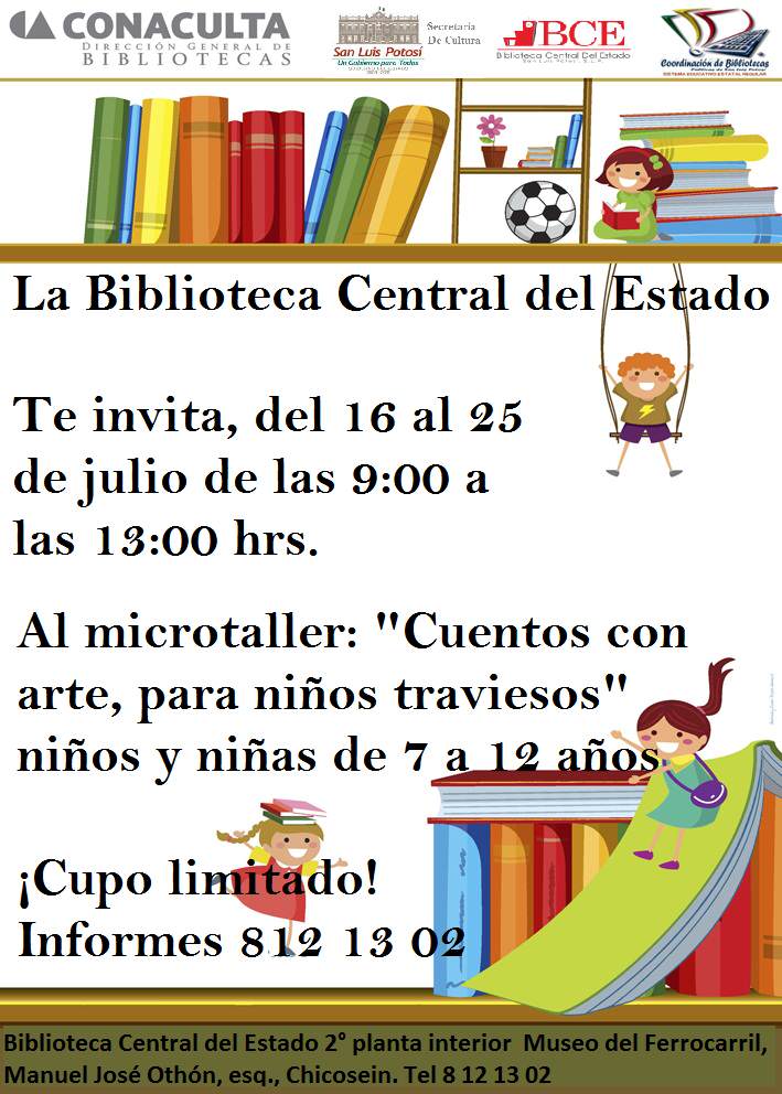 Como parte de un esfuerzo de la Biblioteca Central del Estado por atraer a nuevos lectores a las salas bibliotecarias durante las vacaciones, esta institución ofrecerá del 16 al 25 de julio, en el horario de las 9:00 a las 13:00 horas, el taller titulado “Cuentos con arte, para niños traviesos”, en el cual podrán inscribirse menores de 7 a 12 años.