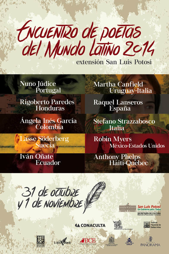 La Dirección de Publicaciones y Literatura de la Secretaría de Cultura, en coordinación con la Biblioteca Central del Estado y el Instituto Potosino de Bellas Artes, invitan al Encuentro de Poetas del Mundo Latino 2014 extensión San Luis Potosí, el cual se desarrollará éste viernes 31 de Octubre y el sábado 1 de noviembre, con la participación de poetas de prestigiada trayectoria provenientes de Portugal, Honduras, Colombia, Suecia, Ecuador, Uruguay, Italia, España, México, E.U, Haití, Canadá, y poetas potosinos.