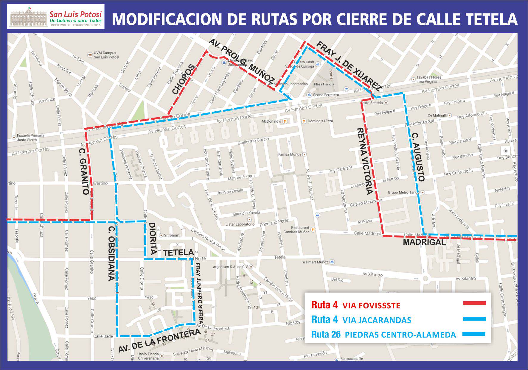 En este sentido, las unidades de la Ruta 4 en sus sentidos oriente-poniente y poniente-oriente y de la Ruta 26 en su sentido poniente-oriente realizarán su recorrido por la calle de Pedregal, Obsidiana, Avenida de la Frontera, Fray Junipero Sierra, Tetela, Diorita, Obsidiana hasta llegar a la Avenida Hernán Cortés para continuar con su recorrido normal.