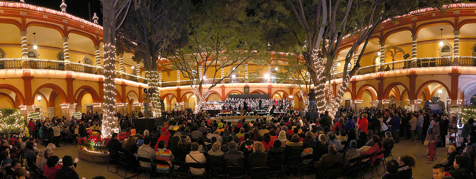 El rector de la Máxima Casa de Estudios Potosina, arquitecto Manuel Fermín Villar Rubio, fue el encargado de encender el interruptor de un antiguo farol, colocado simbólicamente en el escenario, llenando de luz el majestuoso recinto universitario, dejando ver las decenas de flores de nochebuena, el tradicional nacimiento y otros adornos de la temporada.