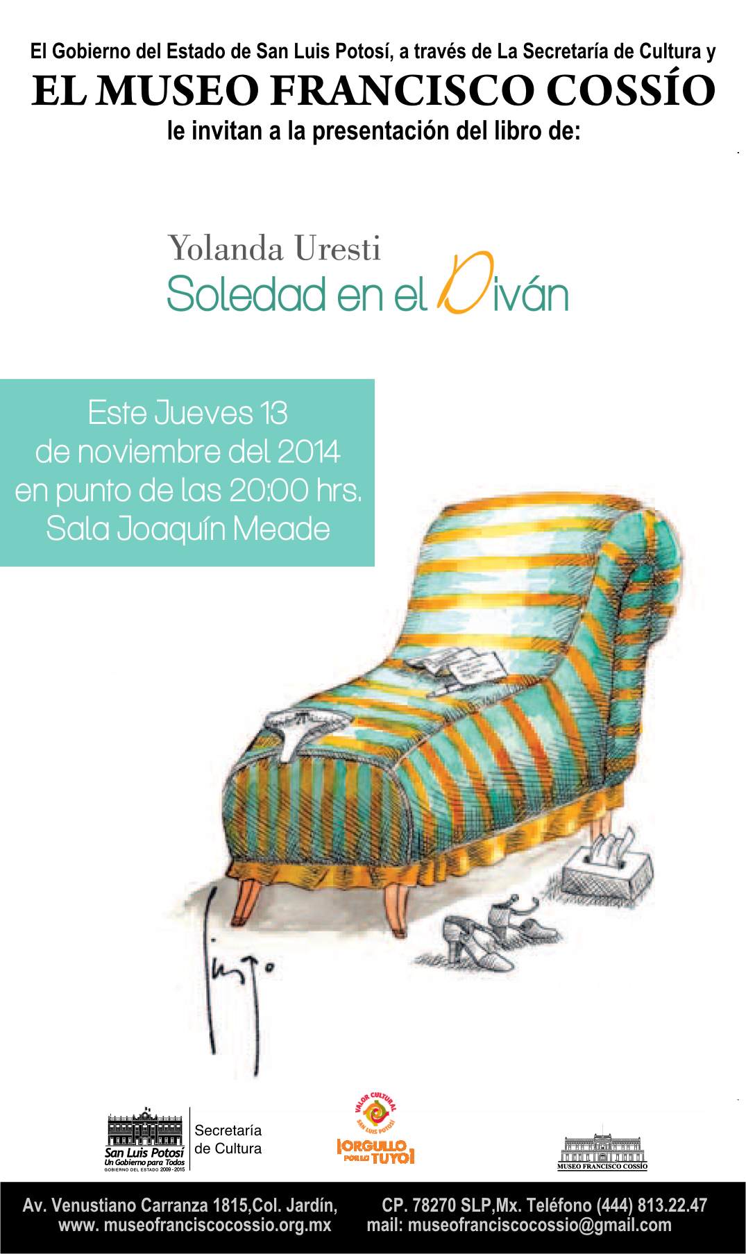 Así que asista este jueves a la presentación de Soledad en el Diván de la potosina Yolanda Uresti en la Sala Joaquín Meade de este museo.