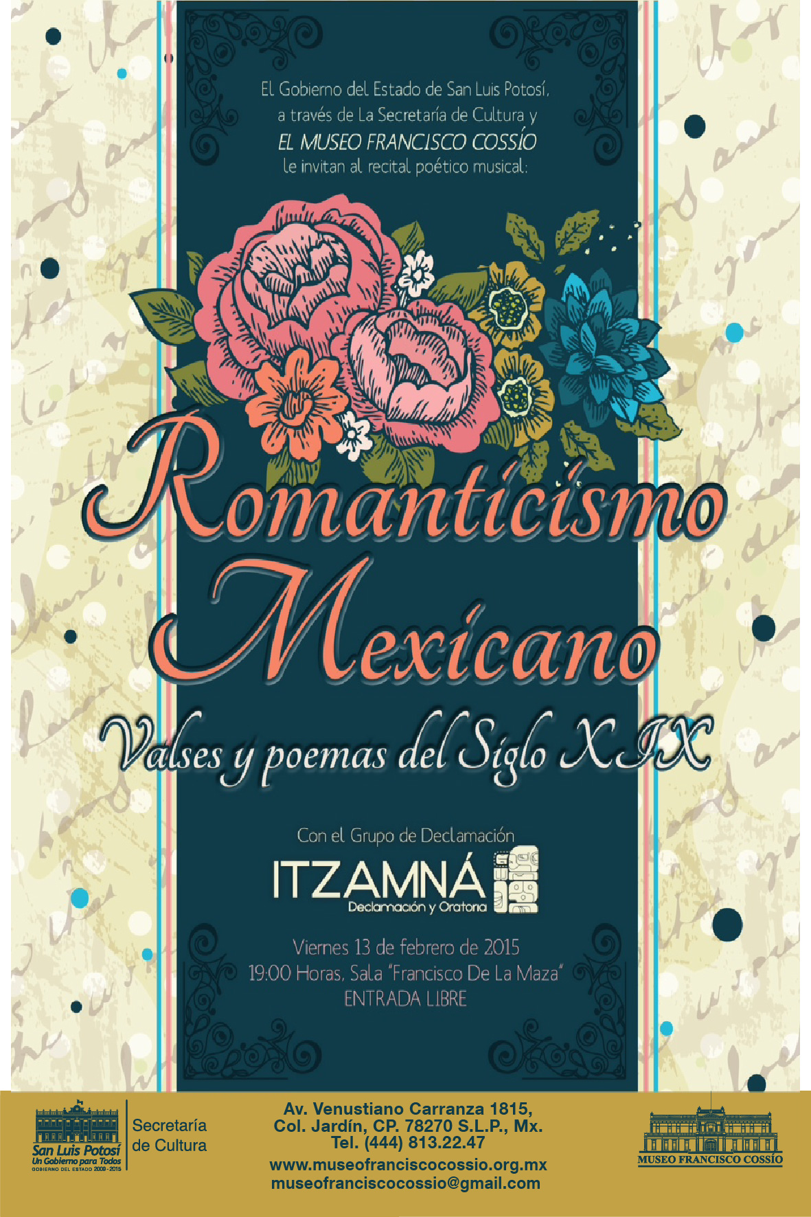 ROMANTICISMO MEXICANO-01Cada año, el Museo Francisco Cossío, presenta por el día del amor y la amistad su recital poético musical, así que este año no podía ser la excepción e invita a todo el público en general a que asista este 13 de febrero en punto de las 20:00hrs. a que asista a escuchar al grupo de declamación Itzamná.