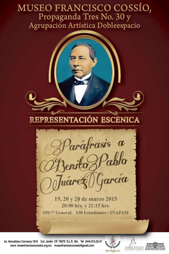 El Museo Francisco Cossío, Propaganda Tres No. 30 y la agrupación artística Dobleespacio, invitan a que asistan a la representación teatral Paráfrasis a Benito Pablo Juárez García, este 19, 20 y 28 de marzo en las instalaciones del Museo Francisco Cossío.