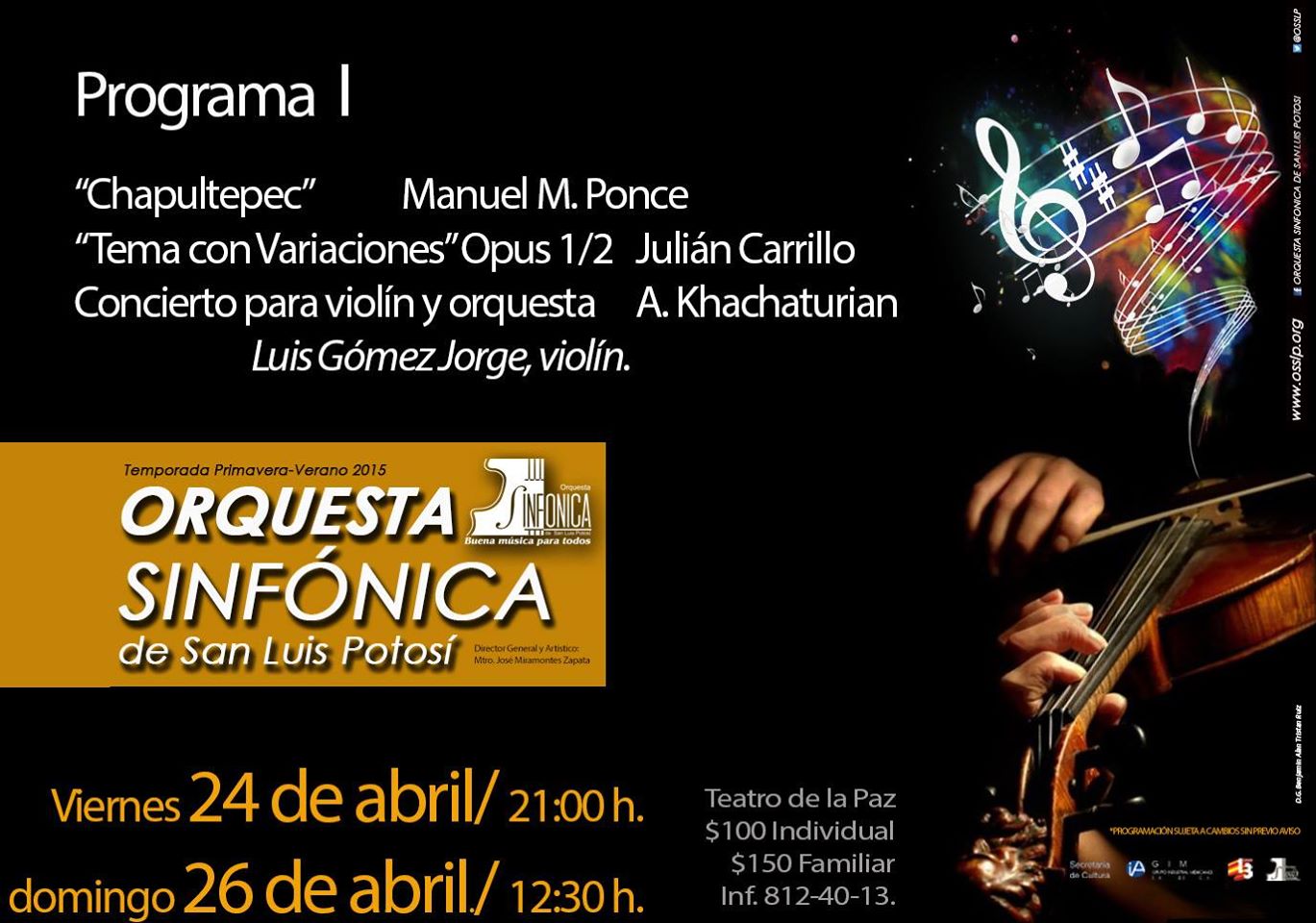 Recuerda que los conciertos son el Viernes 24 de abril a las 21:00 hrs y el Domingo(repetición) a las 12:30 hrs; el costo de los boletos es de $150 Familiar ( Hasta 2 adultos y 2 menores) así como el individual de $100, venta de boletos en la Taquilla del Teatro de la Paz.