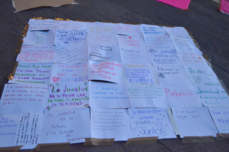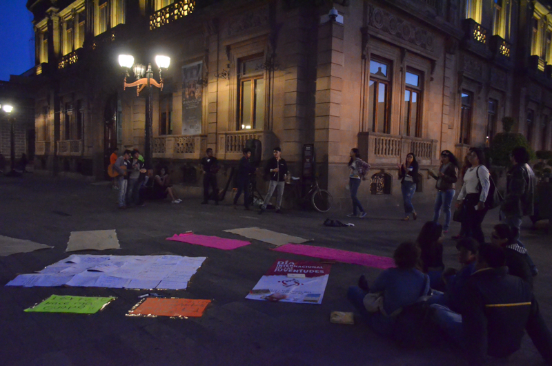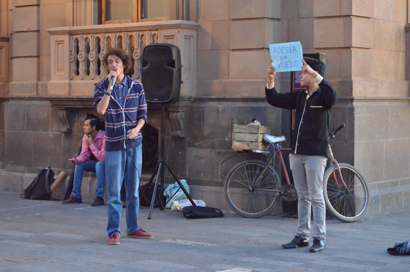 Con integrantes de asociaciones civiles como Poesía en Movimiento, Libros vagabundos, se hizó la callejoneada literaria en la Explanada del Teatro de la Paz, donde se hicieron algunas lecturas de poetas y filósofos, así como un mural urbano donde las personas se podían acercar y plasmar sus pensamiento en las cartulinas.