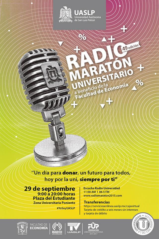 Este martes 29 de septiembre del 2015 arranca el 49 Maratón Radiofónico Universitario, en la explanada de la plaza del Estudiante de la zona universitaria poniente que será a beneficio de la facultad de Economía.