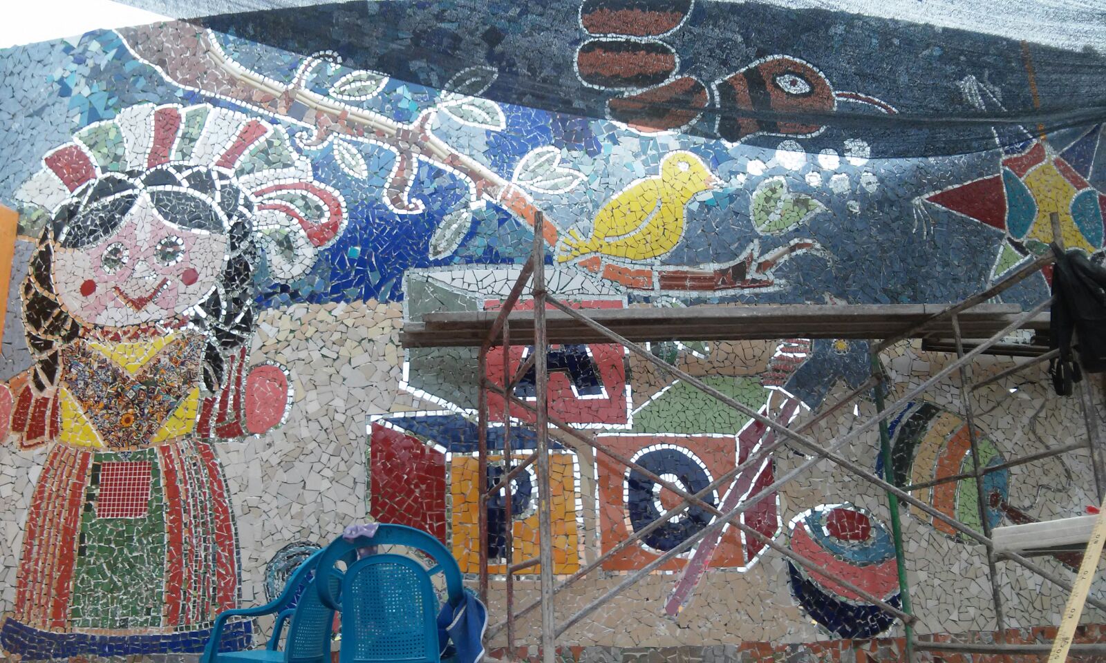 En el caso del diseño realizado por la maestra Mariza Martínez Macías se utilizaron mosaicos y espejos para que en los 50 metros del mural quedara plasmado el “Juguete Mexicano”.