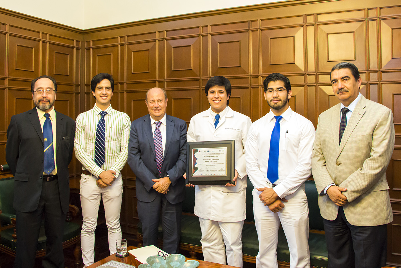 Durante su visita al rector de esta casa de estudios, Arq. Manuel Fermín Villar Rubio para informarle del reconocimiento nacional que recibieron, los alumnos galardonados Luis Fernando Barraza Araiza, Gibrán Alejandro Del Sol Revuelta y Andrés Sánchez Pájaro quienes estuvieron acompañados del director de la Facultad de Medicina, Dr. Alejandro Zermeño Guerra y el secretario del plantel, doctor Carlos Adrián Jiménez González, explicaron los objetivos y alcances de este proyecto innovador de prevención a la salud pública nacional.