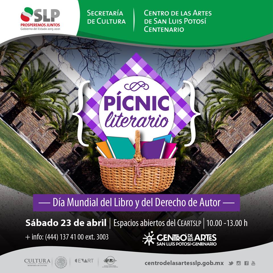 De esta forma es como el Centro de las Artes extiende una cordial invitación para asistir y formar parte de esta conmemoración en el Día Mundial del Libro y Derecho de autor, que se suma a la oferta cultural que la Secretaría de Cultura, a través de los diversos organismos, estará efectuando en esta fecha. Informes al 1 37 41 00 o a través de las redes sociales oficiales del CEARTSLP.