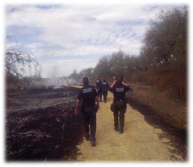 De la misma manera, personal policial participó en el municipio de Ciudad del Maíz en coordinación con personal del Ejercito Mexicano, CONAFORT y Protección Civil Municipal, voluntarios y el comisariado de la localidad en la comunidad de Francia Chica, para sofocar un incendio en 300 hectáreas de pastizal.