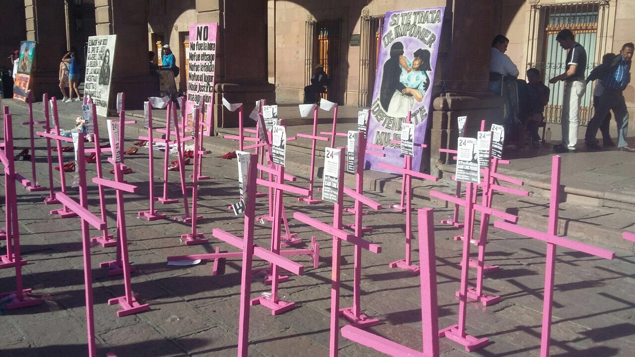 Frente a Palacio Municipal se realizó un performance en el cual se colocaron varias cruces rosas en memoria de las víctimas de violencia de género y la acostumbrada impunidad que las ha re victimizado.