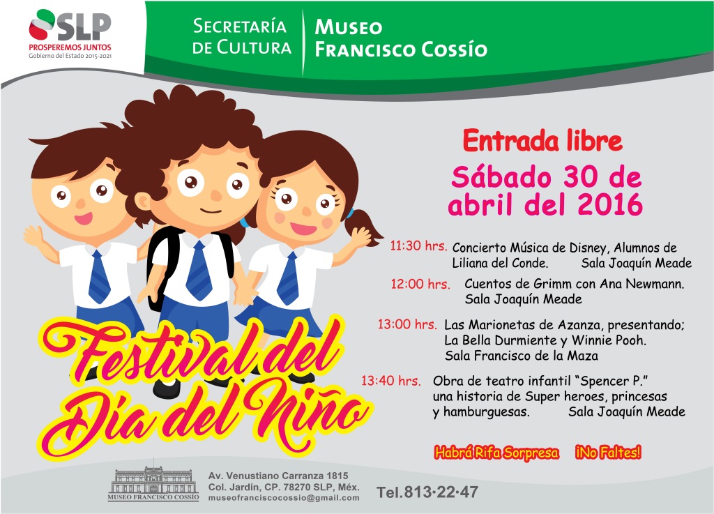 Con motivo del Día del Niño, la Secretaría de Cultura a través del Museo Francisco Cossío, invitan al Festival del Día del Niño, en donde se presentarán diferentes actividades para todos los pequeños, así que traiga a los pequeños a festejar su día este sábado 30 de abril a partir de las 11:30 de la mañana en las instalaciones del Museo, la entrada será libre.