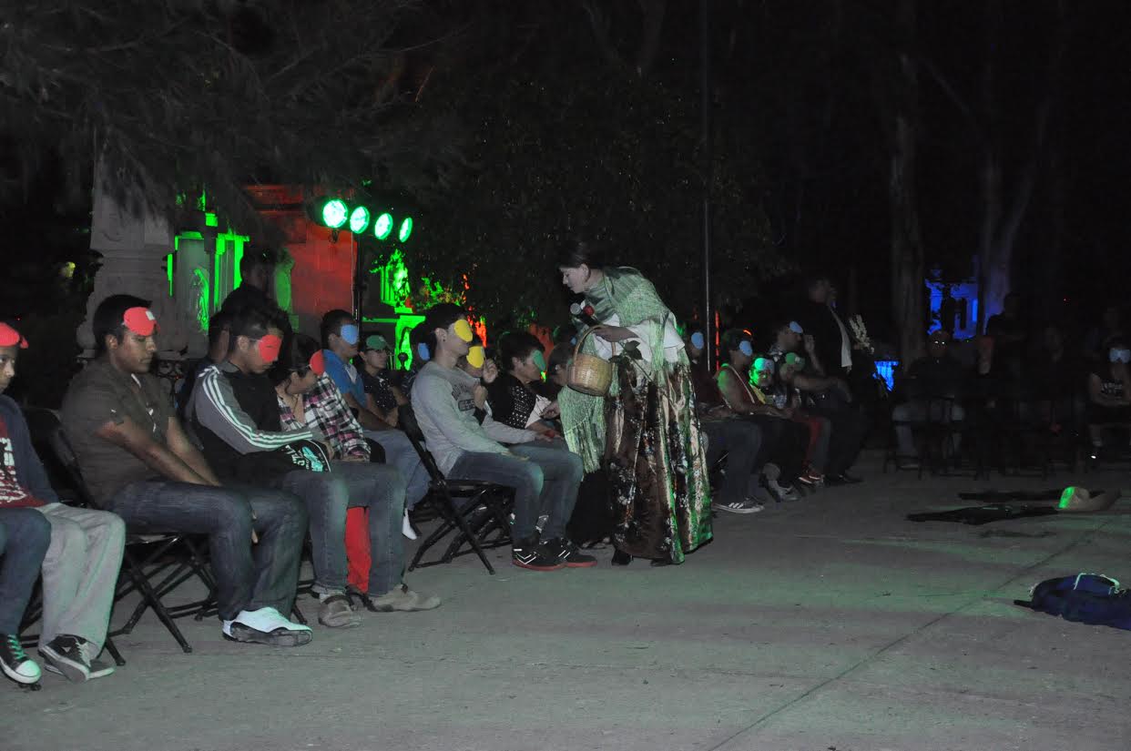 Se utilizará la técnica de sensorama mediante la cual a través de efectos sonoros grabados y en vivo, además de elementos al tacto, aromas, y música, se pretende sensibilizar a los asistentes, a través del arte escénico a la compresión de las personas con discapacidad y establecer el respeto a los espacios públicos. Todos entran tomados de los hombros, los lleva un guía a la parte central del cementerio y permanecen sentados.