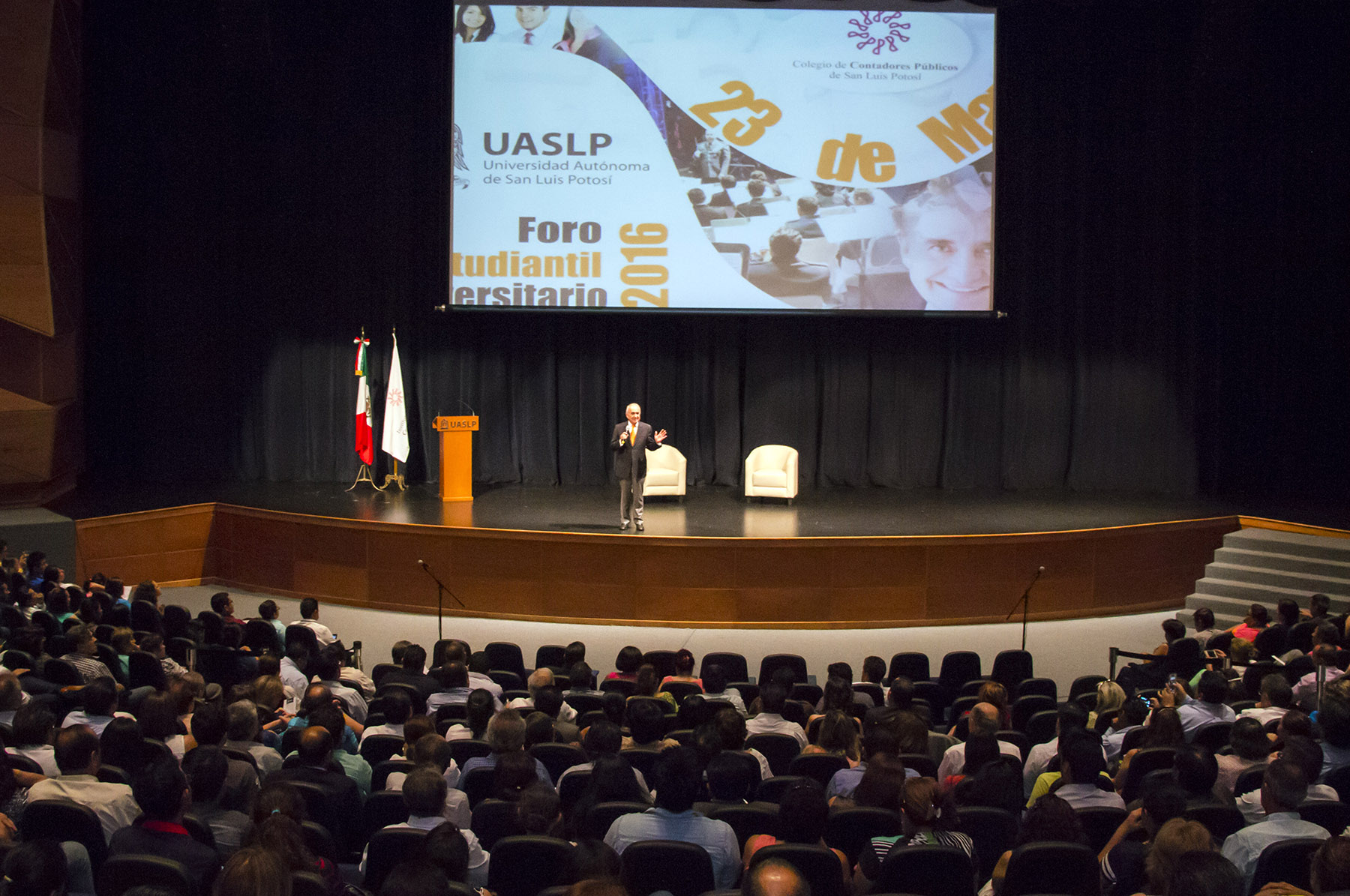 Esto durante el Foro Estudiantil Universitario 2016, organizado por la Facultad de Contaduría y Administración de la Universidad Autónoma de San Luis Potosí y el Colegio de Contadores Públicos de San Luis Potosí, donde habló del panorama económico, social y político de México, así como las condiciones de México luego de las reformas estructurales.