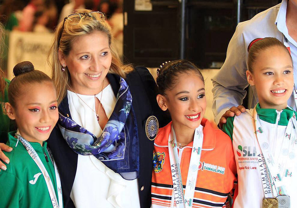 Su entrenadora de Sergeevna Arias siempre estuvo muy al pendiente de todas sus actuaciones en cada una de la modalidad aconsejándola sobre sus movimientos en busca