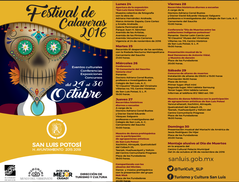Gran diversidad de eventos y cultura para todos los potosinos se presentará del 24 al 30 de octubre.El Ayuntamiento de San Luis Potosí, a través de la Dirección de Turismo y Cultura, presentó el Festival de Calaveras 2016, el cual contará con eventos culturales, conferencias, exposiciónes y concursos para el público asistente del 24 al 30 de octubre.