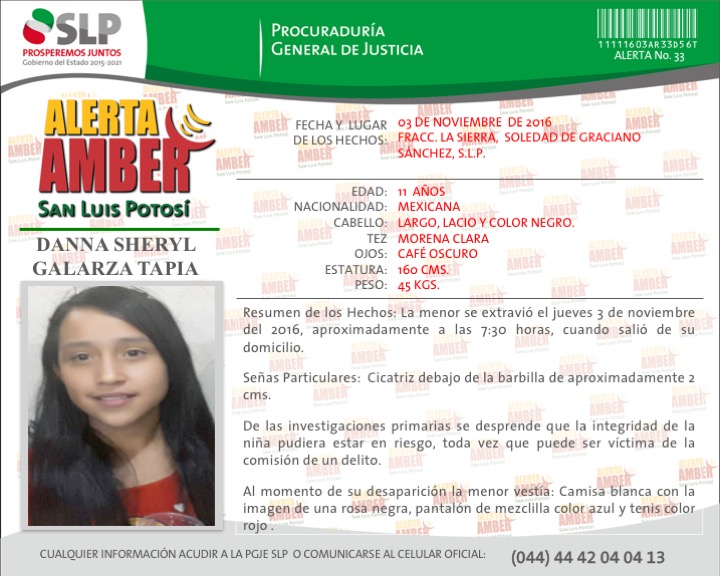 SLP.- La Procuraduría General de Justicia del Estado (PGJE) activó una Alerta Amber para localizar a la menor Danna Sheryl Galarza Tapia de 11 años de edad, misma que salió de su domicilio la mañana de este jueves 3 de noviembre de 2016, sin que haya regresado hasta el momento.