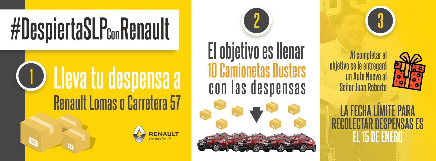 El objetivo es llenar 10 camionetas Duster con cajas de despensa, se tiene hasta el día 15 de enero para poder cumplir con la meta. Una vez logrando dicha meta, la agencia se comprometió a entregarle un auto nuevo a Juan Roberto, para que pueda seguir saliendo adelante como chofer de Uber.