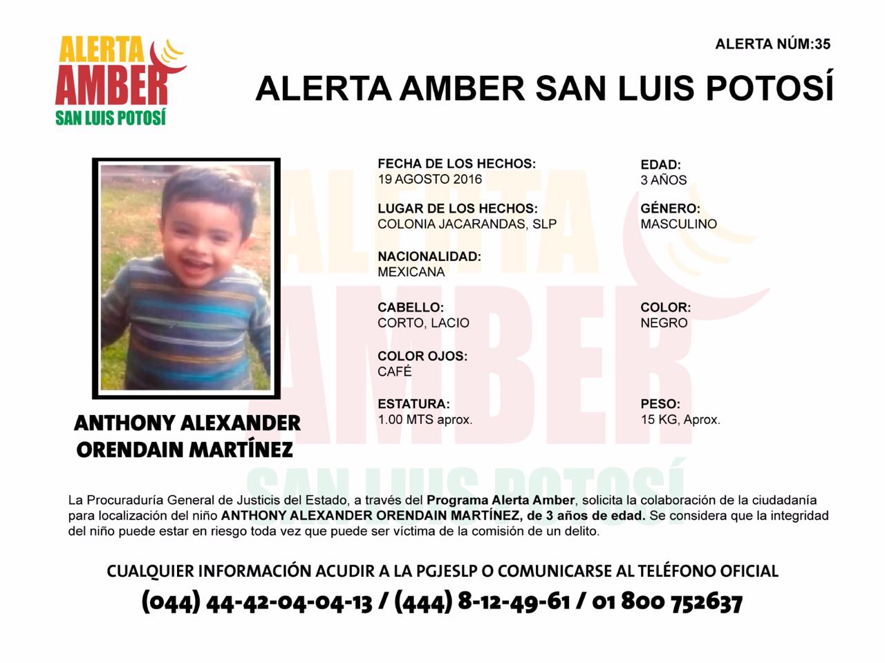 El menor fue visto por última vez el el pasado 19 de agosto de 2016, en la colonia Jacarandas de la ciudad de San Luis Potosí, cuando su madre se lo llevó, por lo que se considera que la integridad del niño pueda estar en riesgo, toda vez que pudiera ser víctima de algún delito.