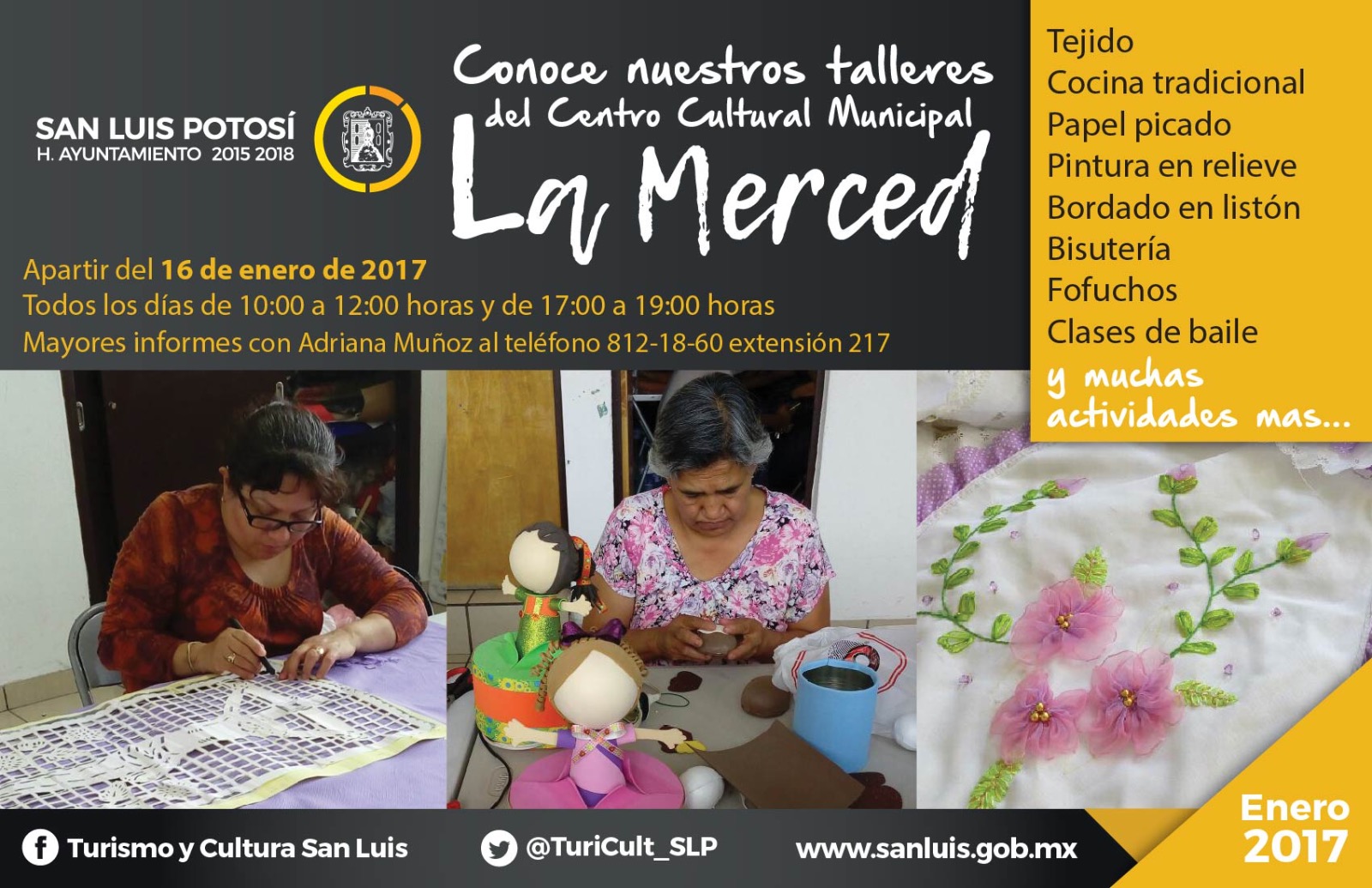 Para mayores informes, en el Centro Cultural Palacio Municipal con Adriana Muñoz o al teléfono 8121860 extensión 217, en nuestras redes sociales, Facebook: Turismo y Cultura San Luis,  Twitter: @TuriCult_SLP y a través de internet en www.sanluis.gob.mx