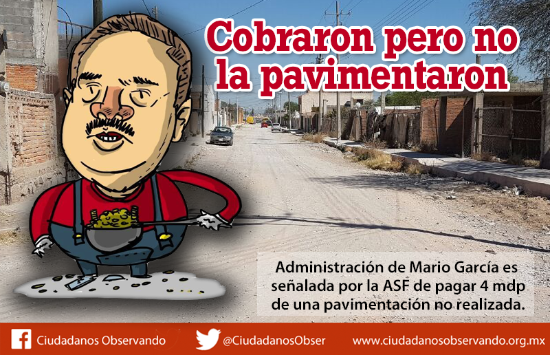 Lo anterior fue observado por la Auditoria Superior de la Federación donde señala un probable daño a la hacienda pública. La empresa que fue contratada para realizar estra obra es Cosntru Martell Sa de Cv y es evidente que la obra de pavimentación no fue realizada tal como se aprecia en las fotografías y hasta la fecha tampoco se continúa con la ejecución de los trabajos contratados.