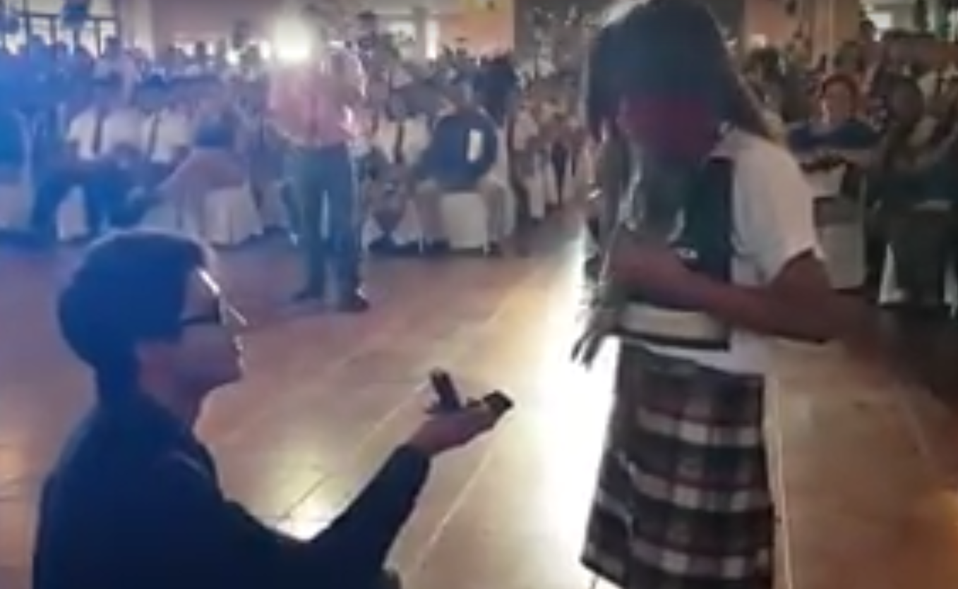 La joven se muestra contenta e incluso llora, aceptando la propuesta de matrimonio, mientras que los asistentes tanto alumnos como maestros aplauden.